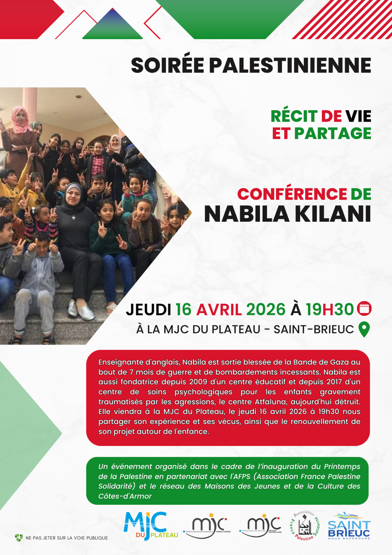 Conférence-Débat avec Nabila Kilani. Récit et témoignages sur la vie à Gaza bombardée et en ruines et le traumatisme des enfants que Nabila et son équipe accompagne dans un contexte apocalyptique